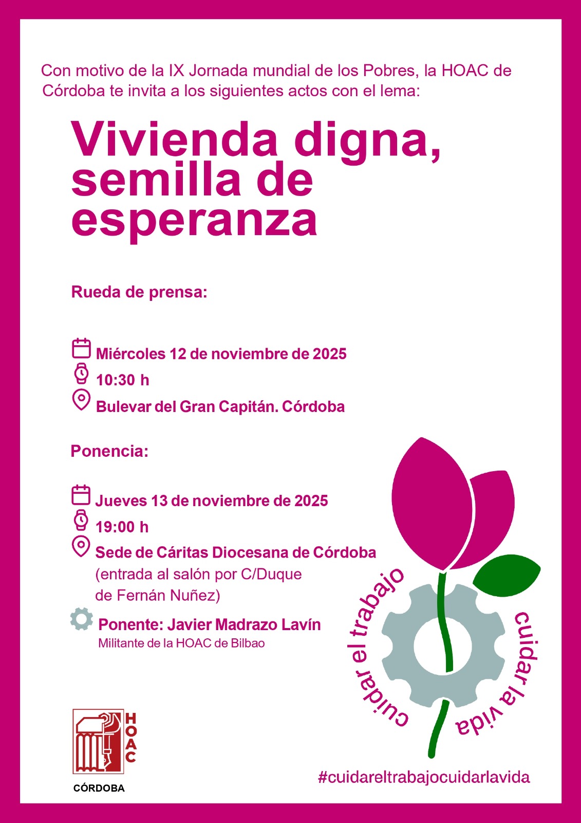 - jueves 13 de noviembre 19:00 ponencia “VIVIENDA DIGNA, SEMILLA DE ESPERANZA” a cargo de Javier Madrazo Lavín, militante de la HOAC de Bilbao. (Salón de Actos de Cáritas Diocesana, c/Pérez de Castro n.º 4).